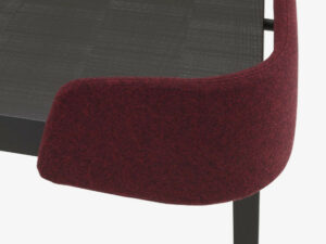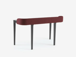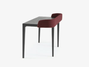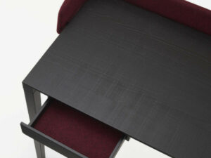 Piétement en frêne massif teinté anthracite, plateau en chêne massif plaqué chêne scié teinté anthracite. Le retour arrière du bureau est garni de mousse et tapissé en DIVINA graphite M180 (non déhoussable malgré la présence d’une fermeture à glissière).