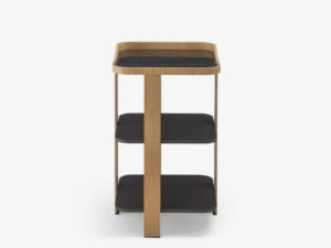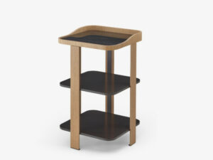 D’apparence légère, asymétrique, évidée, on retrouve les formes arrondies de ce chevet en multiplis de 8 mm replaquée de chêne naturel, de chêne ton noir ou de noyer. Le pied est plaqué chêne naturel, chêne ton noir ou noyer et comporte en son centre à l’arrière un renfort métallique plat qui rigidifie le tout.