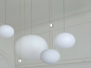 Suspension avec abat-jour vissé en résine transparente Ø 8 cm, avec une réservation dépolie sablée pour accueillir l’ampoule. Câble électrique décor laiton de 2.50 mètres. Système de réglage en hauteur par coulistop. Pavillon Ø 40 cm H = 3 cm, laqué époxy blanc satiné. Livrée avec 9 ampoules LED 1.2W 12v G4, température de couleur 3000K (blanc chaud), 100 Lumens. Ampoule LED non dimmable.